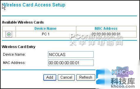 如果上面‘Available Wireless Cards’中有显示您的无线网卡的信息,则直接可以选择左边的小圆点选中,再点Add,否则则需要在‘Device Name’和MAC Address中分别填写电脑标识和无线网卡的MAC地址: