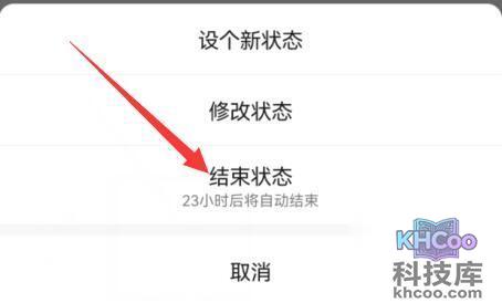 4、最后在弹出菜单里点击“ 结束状态 ”就可以取消微信状态了。