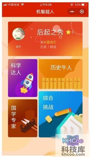 2、然后在里面选择自己擅长的题目类型,这里分为“后起之秀”、“科学达人”、“历史牛人”、“国学专家”、“综合挑战”几种,点击进入答题页面。