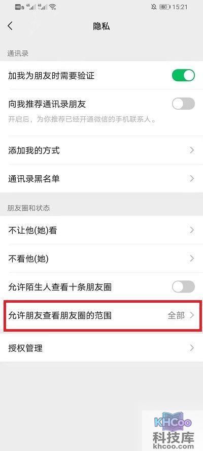 4、在其隐私界面中,就可以看到【允许朋友查看朋友圈范围】点击打开(如图所示);