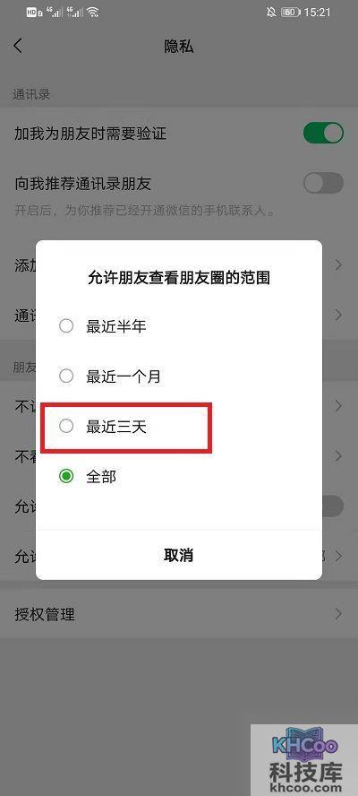 5、最后在其中选择【最近三天】就可以设置为三天可见(如图所示)。