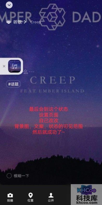 5、然后会自动跳到状态页面,改改文案、背景图、状态权限啥的。(此时那首歌曲已经被成功分享了);