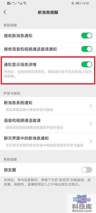 4、在【新消息提醒】界面,点击【通知显示消息详情】点击关闭即可完成。
