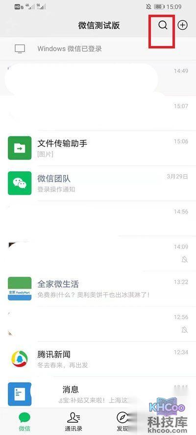 1、首先我们需要打开微信,在微信聊天界面点击上方的【放大镜图标】进入到搜索框;