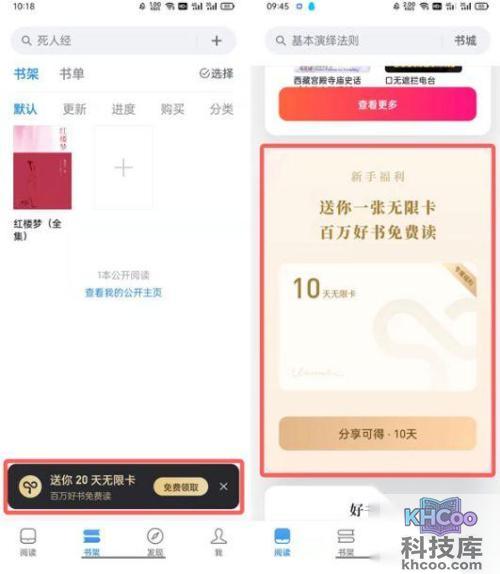 如果你的账号为刚注册、首次登陆,在前几天可以免费领取新手福利,通过【阅读】或者【书架】页面可免费领取到20天无限卡;