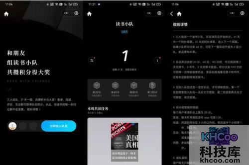 通过【我】-【关注】-【读书小队】打开连接自动跳转到微信小程序中,然后邀请你的两位好友加入读书小队,和好友每天坚持读书获得积分,用积分兑换获得无限卡、书币等;