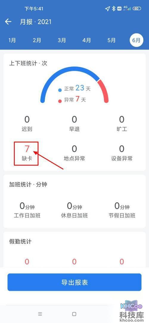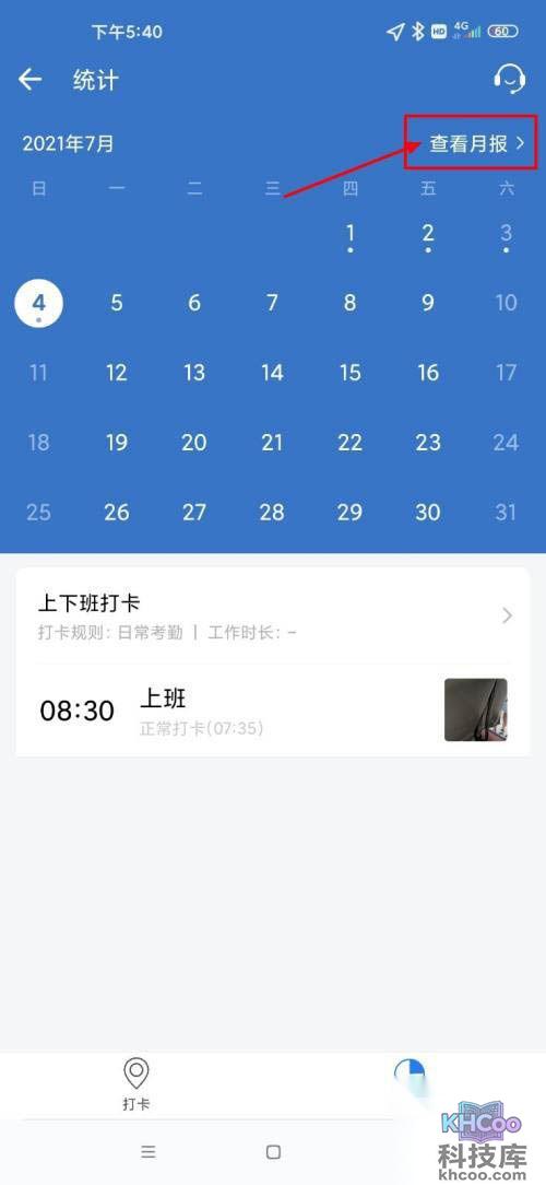 2、点击右上角的三个点,点击查看月报,点击缺卡。