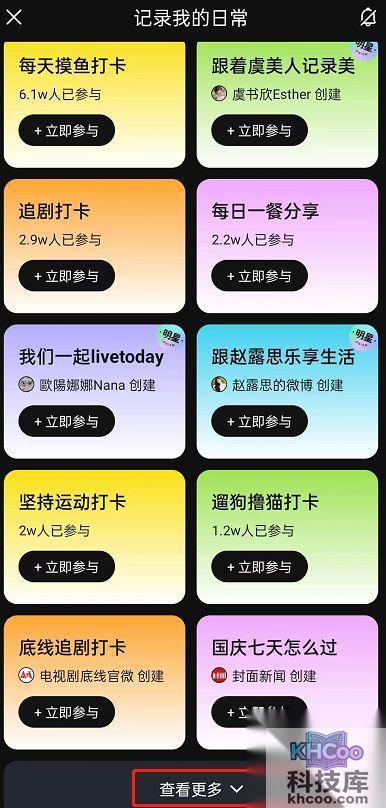 6、回到记录我的日常,点击查看更多。这里还有更多话题,您可以选择喜欢的进行 打卡 记录。