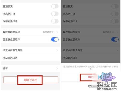 4、在 聊天 信息页面滑到底部点击删除并退出,在弹出选项中点击确认即可。
