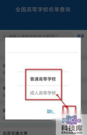 8、点击“普通高等学校”,可选择“普通高等学校”或“成人高等学校”,点击“确认”。