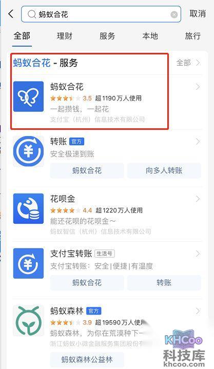 1.进入支付宝APP, 搜索 蚂蚁合花服务