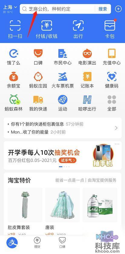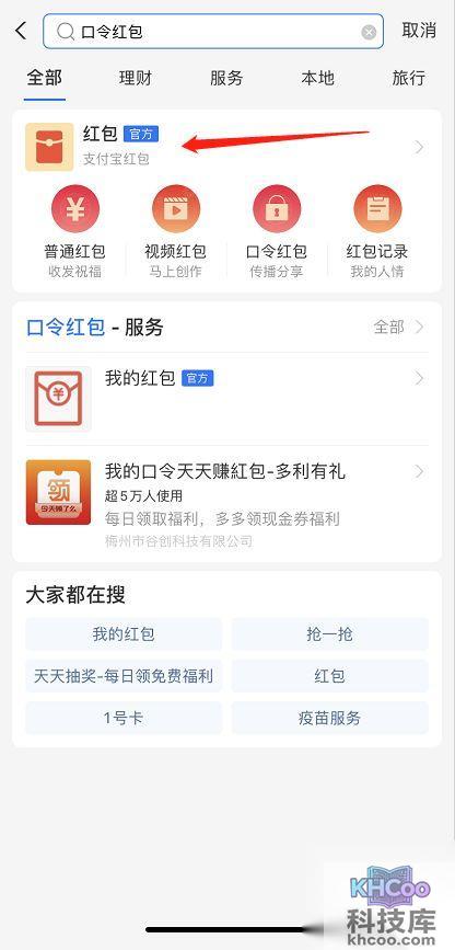 1.进入支付宝首页, 搜索 “红包”进入界面