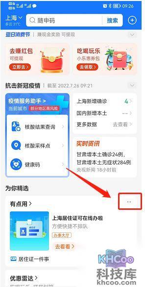 1、在支付宝首页下滑找到为你精选内容,点击推荐内容右侧的【..】。