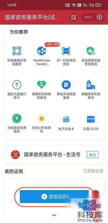 3、在国家政务服务平台小程序中,下滑找到“我的证照”,点击【+添加证照】;