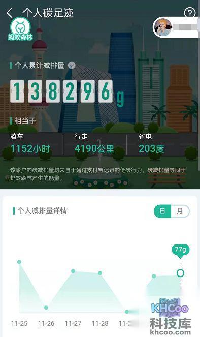 3、在这里就可以查看自己的碳足迹啦。每天和每月减排量详情您可以自由切换查看。
