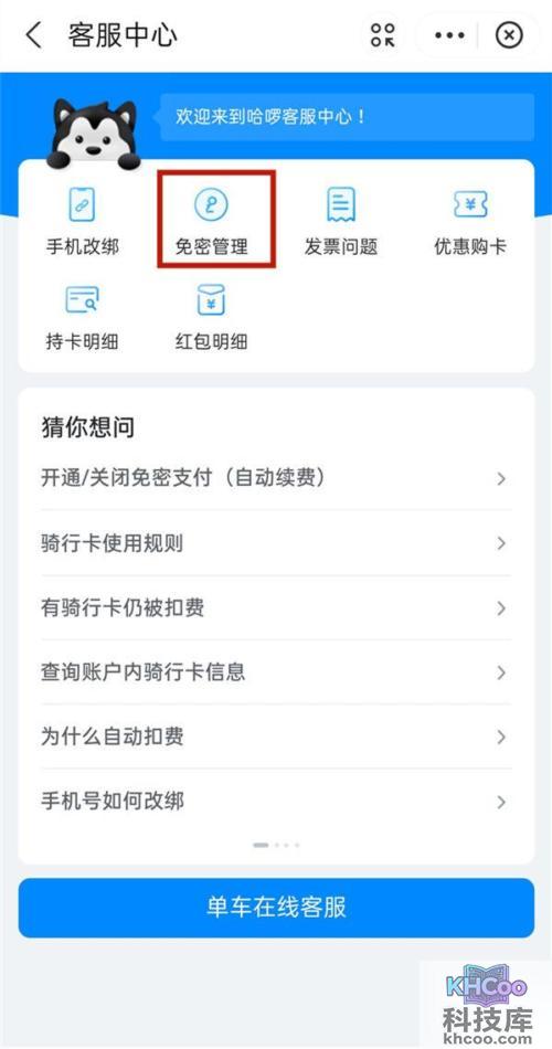 2、从客服中心界面中点击免密管理。
