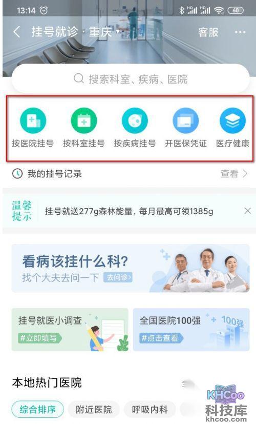 4、 可以选择红色方框中的预约方式,此处以“按医院挂号”为例,点击打开。