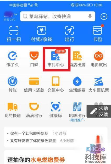 2、进入支付宝,点击“市民中心”,如图红色文本框: