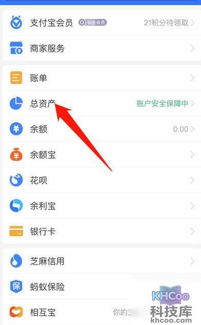 1、打开手机支付宝APP;点击”我的“,进入”我的“,找到”总资产“,点击进入;